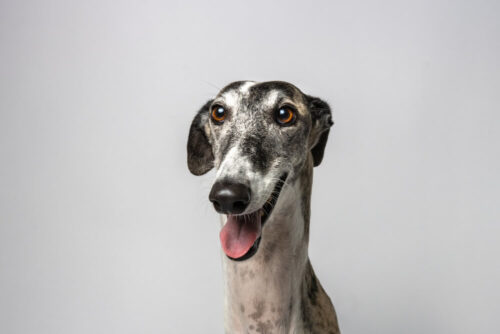 Close-up portrait of a white greyhound wearing a collar, photographed outdoors by Maggie Gongolevich.